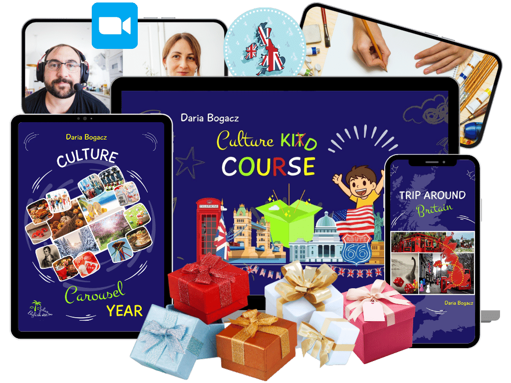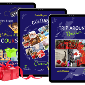 Please, note that the 6-week course (“Trip Around Britain”) will start in January and the 4-week course (“Culture Carousel Year”) will be released in April. The first e-book: „Culture KIT” will be available in December the other two – right after the end of the courses. This special price is just a one-time pre-sale offer, available only now, and will never repeat again.