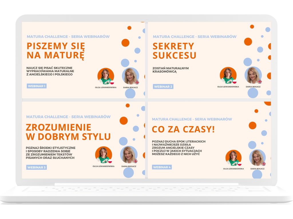 Zainwestuj w cztery webinary, omawiające przygotowania do matury z języka angielskiego i języka polskiego. Poznaj sposoby na sprawne i skuteczne wypracowanie maturalne, udany egzamin ustny, skuteczne rozumienie tekstu pisanego i słuchanego, rozpraw się z czasem, czasami angielskimi i czasami w których tworzyli najwybitniejsi pisarze i poeci. Co zyskasz dzięki tej inwestycji?