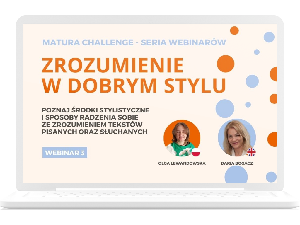 Marzysz o maturze zdanej z założonym, wysokim wynikiem ale obawiasz się czy podołasz wszystkim zadaniom? Zainwestuj 3 s webinarów z serii webinarów pod wspólnym hasłem: MATURA CHALLENGE. Podczas webinaru, wraz z doświadczonymi korepetytorkami i autorkami materiaów edukacyjnych, przejdziesz po kolei istotne kroki, które pomogą Ci wykorzystać właściwe środki stylistyczne na języku polskim i dostrzec w słuchanym, bądź czytanym tekście słowa i zwroty potrzebne do poprawnego wykonania ćwiczeń. Nauczysz się robić notatki, zwracając uwagę na istotne elementy tekstów i cieszyć się spodziewanym sukcesem podczas egzaminu.